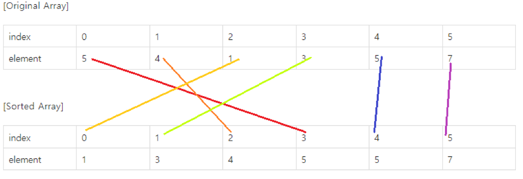 ์ด์ , ์๋ณธ ๋ฐฐ์ด์ element๊ฐ ์ ๋ ฌ๋ ๋ฐฐ์ด์์ ๋ช ๋ฒ์งธ์ธ์ง ์ถ๋ ฅํ๋ฉด ๋๋ค.
