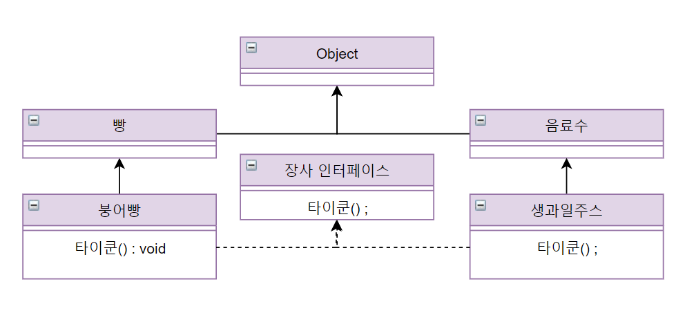 ์ธํฐํ์ด์ค๋ ์ด๋ ๊ฒ ์๋ก ์์ ๊ด๊ณ๊ฐ ์๋ ํด๋์ค๋ค์๊ฒ ๊ด๊ณ๋ฅผ ๋ถ์ฌํด ์ค ์ ์๋ค. ์ฅ์ฌ ์ธํฐํ์ด์ค๋ฅผ ์ด์ฉํ์ฌ, ์ด๋ฏธ ๋นต์ ์์ํ ๋ถ์ด๋นต๊ณผ, ์๋ฃ์๋ฅผ ์์ํ ์๊ณผ์ผ ์ฃผ์ค ์ฌ์ด์ ํ์ด์ฟค์ด๋ ๊ด๊ณ๋ฅผ ๋งบ์ด์ค ์ ์๊ฒ ๋๋ค. ์ด๋ ์ฝ๋์ ์ฌ์ฌ์ฉ๋ฅ ์ ๋์ด๊ณ ํจ์จ์ ์ธ ๊ด๋ฆฌ๋ฅผ ๊ฐ๋ฅํ๊ฒ ํด์ค๋ค.